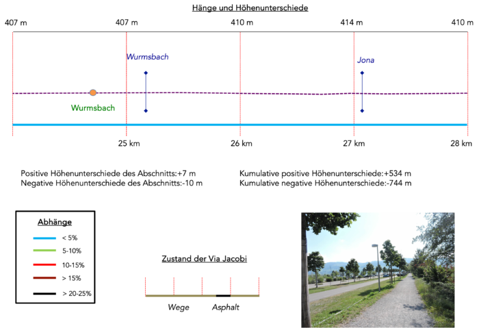 Überblick über die Schwierigkeiten der Strecke: Eine recht einfache Achterbahnfahrt; der Abstieg nach Schmerikon ist ziemlich steil, dann beginnen die Ferien.