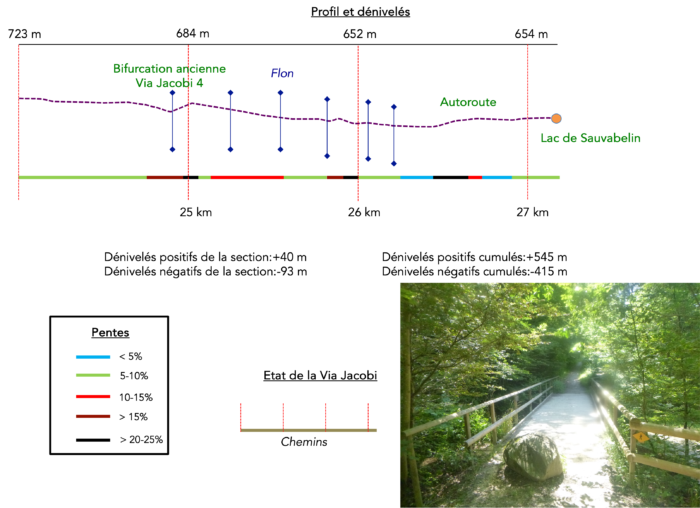 Cette traversée des bois, qui se poursuit au-delà de Chalet à Gobet dans l’immensité du Jorat, est une ode à la nature, fréquentée par une légion de joggeurs, de cyclistes et de randonneurs, tous disciples de la beauté lausannoise. Ce périple s’achève en rejoignant l’ancienne voie dans la vallée sauvage du Flon. Par une grâce inattendue, le parcours évite les zones urbanisées, sauf de rares exceptions. Mais le chemin réserve encore bien des merveilles. Après le passage idyllique par le vallon du Flon et une ascension ardue par des escaliers jouxtant l’autoroute, vous atteindrez le bois de Sauvabelin et son lac, bijou posé sur les hauteurs de Lausanne. La descente vers Lausanne, les yeux caressant le lac, jusqu’au cœur de la ville, puis jusqu’aux rives du lac, sera narrée dans les pages suivantes. La nouvelle Via Jacobi 4 se distingue par un balisage exemplaire, une nécessité absolue. Les bois du Jorat sont un dédale de sentiers où il est aisé de se perdre, de se retrouver transporté dans un ailleurs pour tout randonneur non initié aux mystères de ces lieux.
